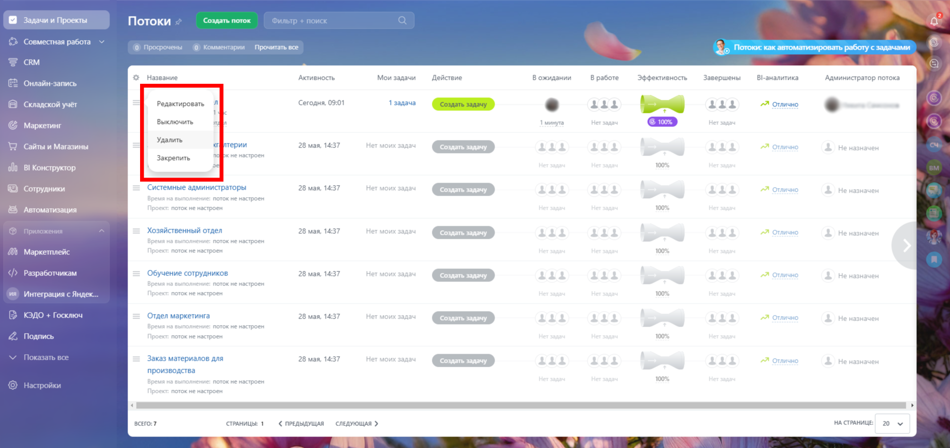 Однако удалять Поток необязательно. Если вы просто хотите приостановить его работу, используйте функцию «Выключить». Поток будет скрыт из общего списка, а сотрудники не смогут ставить в нём задачи. Позже вы сможете снова включить его и продолжить работу с сохраненными настройками.