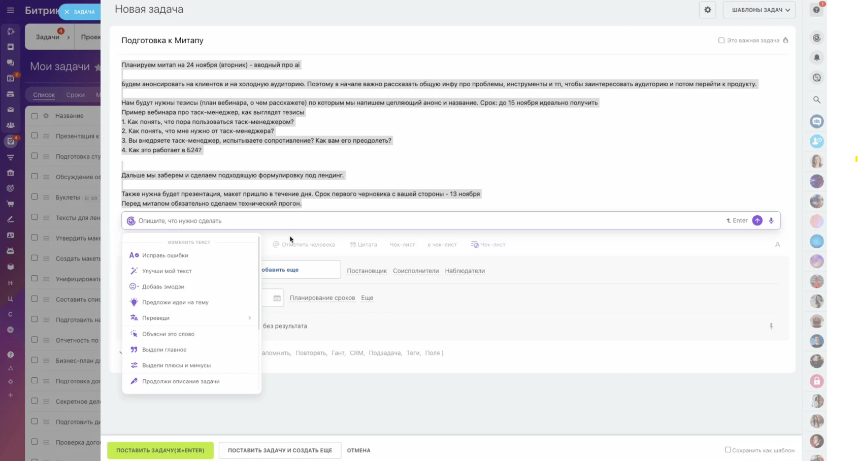 Copilot Bitrix24 помогает быстро и точно ставить задачи. Просто набросайте черновик, и AI-ассистент превратит его в четкое описание с чек-листом. Он также прочитает все комментарии, выделит главное и подготовит ответ. С помощью заранее подготовленных препромптов вы сможете быстро создать задачу или ответить на комментарии.