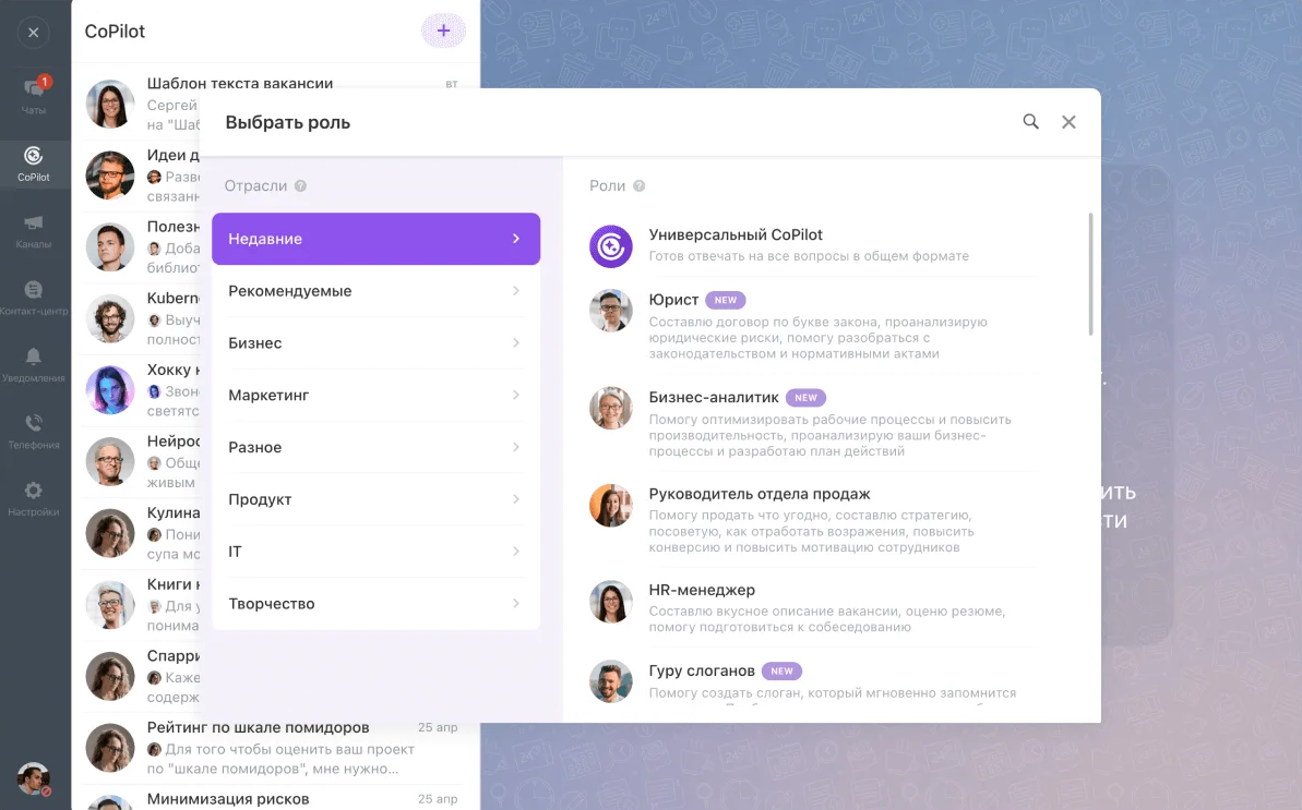 CoPilot поможет вам быстро решать разные задачи, будь то создание текста рассылки или генерация нестандартных идей для бизнеса. Он может быть вашим личным помощником в более чем 30 ролях: руководителя отдела продаж, юриста, HR-менеджера, поэта и других. При этом в чат с ИИ можно пригласить коллег, чтобы совместно задавать вопросы и обсуждать идеи. Ответы CoPilot будут видны всем участникам чата, а добавить людей можно в любой момент — как при создании чата, так и в процессе общения.