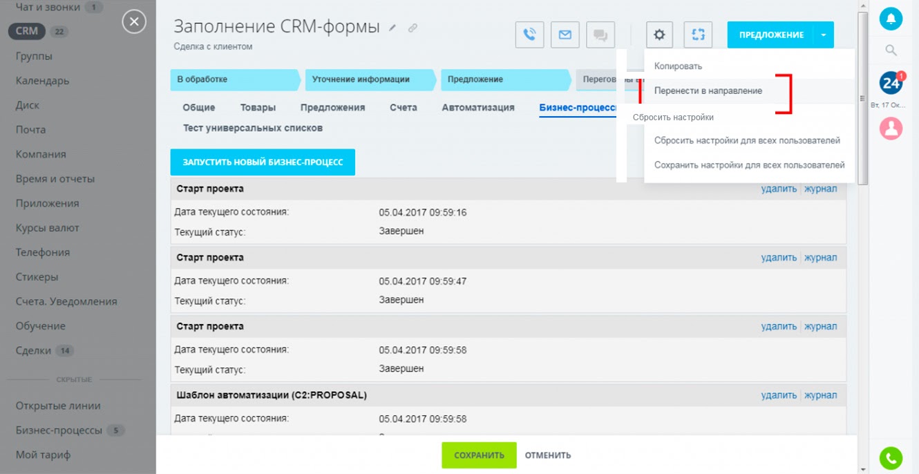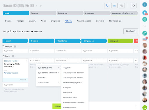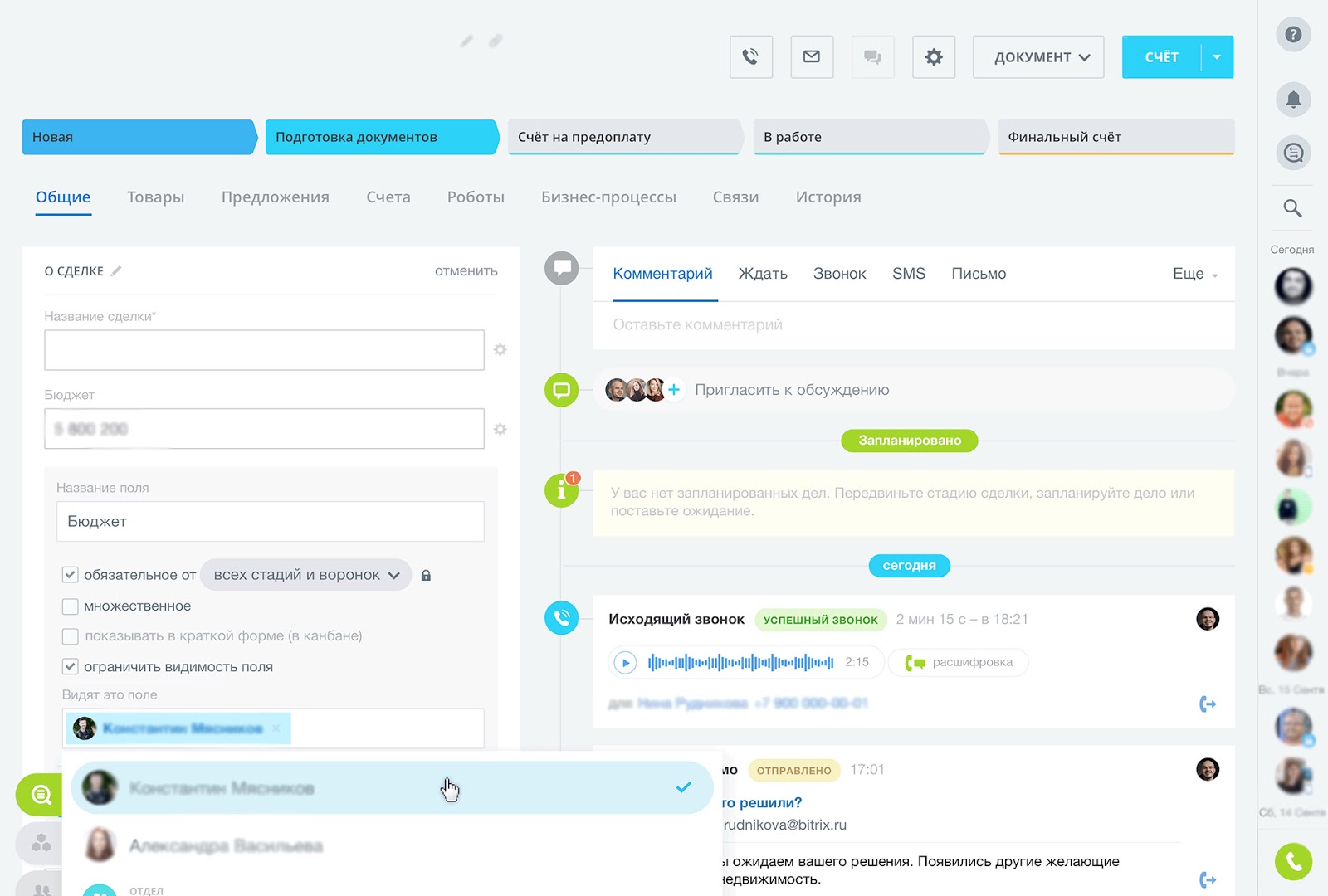 В системе остается история общения с клиентами (записи разговоров, переписка), и сотрудники могут легко найти предыдущие сделки и любую информацию по сделкам спустя продолжительное время.