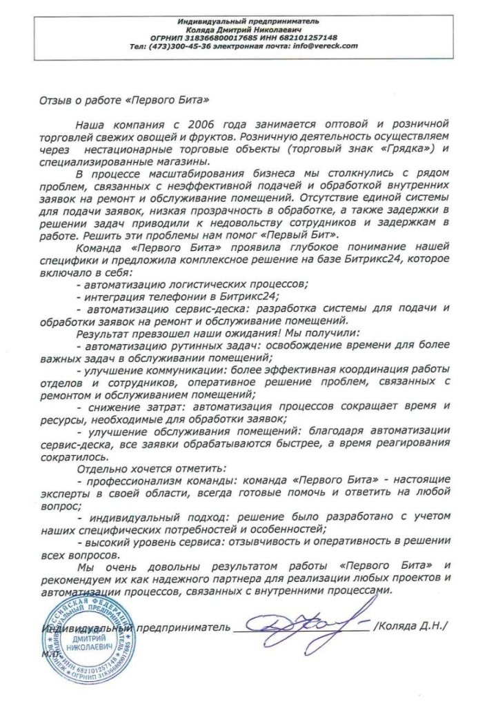 Компания “Грядка” обратилась в Воронежский офис “Первого Бита”, чтобы решить эти проблемы. Мы предложили комплексное решение на базе Битрикс24, которое позволило автоматизировать и оптимизировать 4 ключевых процесса: